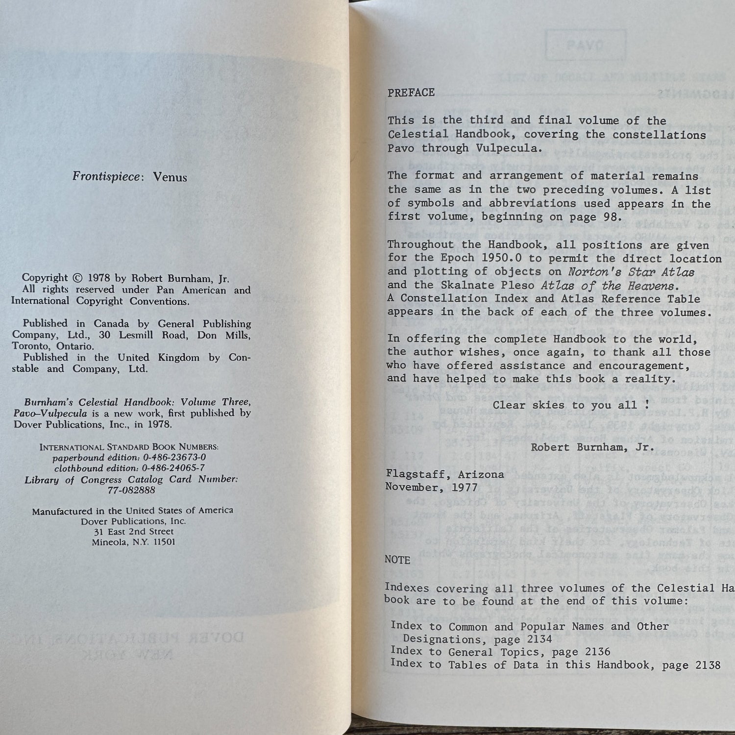 This is the complete three-volume hardcover set of Burnham's Celestial Handbook by Robert Burnham Jr., staff member of Lowell Observatory from 1958 to 1979, published by Dover Publications in 1978.