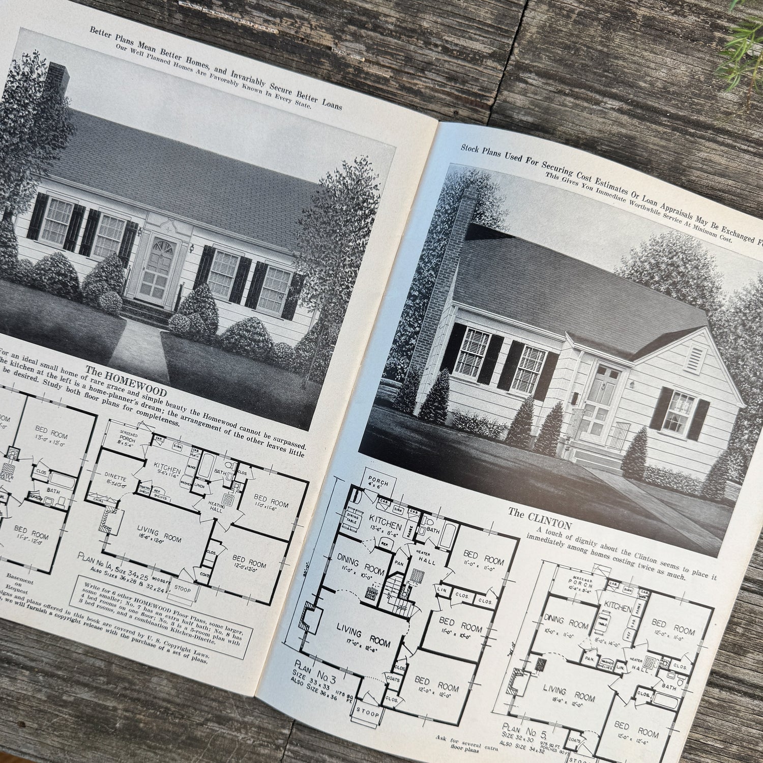 The catalog presents a range of residential designs, including Tudor, Colonial, and ranch-style homes, each shown with photographs, floor plans, and blueprint pricing.