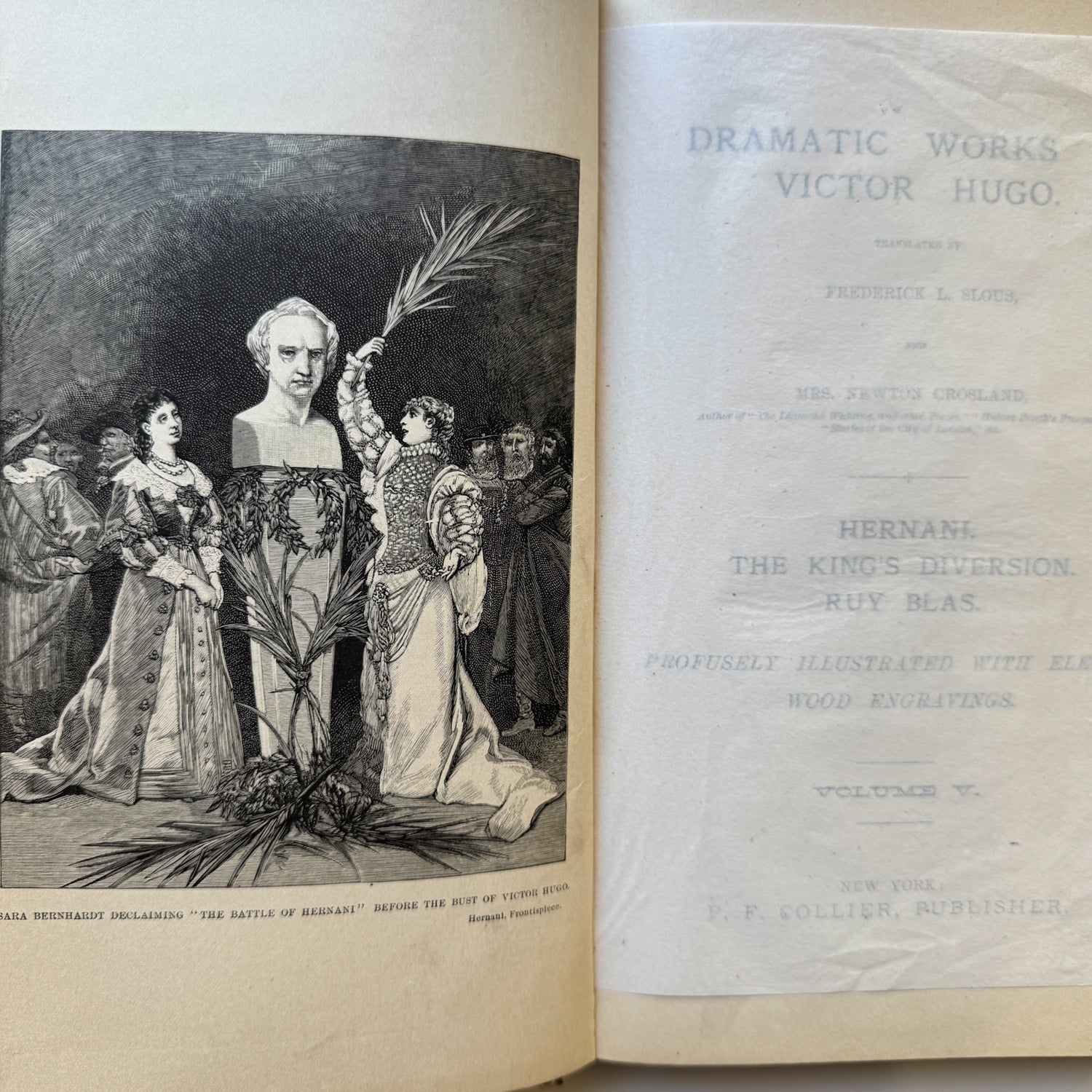 Antique illustrated editions of The Novels of Victor Hugo published by P.F. Collier, New York, in the late 19th century. These richly detailed volumes feature gilt-stamped brown cloth covers and are illustrated with elegant wood engravings.