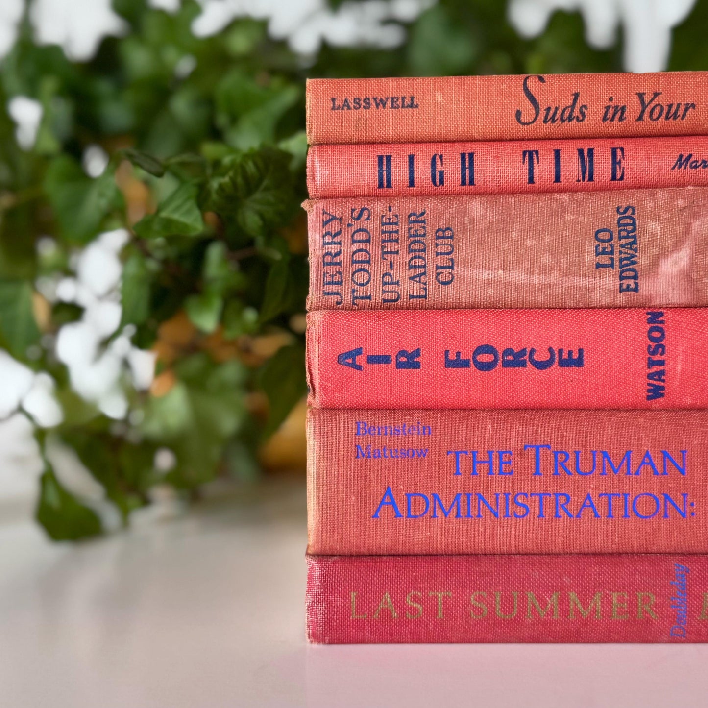 These are all vintage books and show various signs of aging, which may include damaged spines, smudges, fading, bumped corners, etc. All these natural signs of age are what make vintage books such a unique, charming, and cozy design choice!